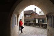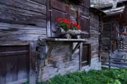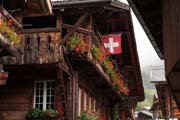 cobblestones and wooden chalets decorated with flowers and carvings.