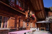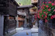 cobblestones and wooden chalets decorated with flowers and carvings.